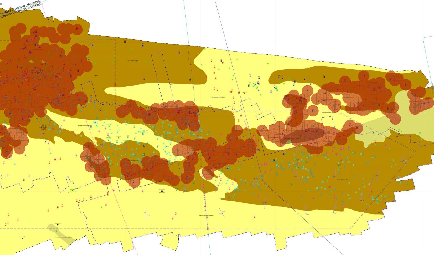 Anschließend plotteten wir die Bereiche in denen sich mehr als 21 solcher Kreise überschneiden. So entstand eine Darstellung von potentiellen geogenen Riffstrukturen die dem Lebensraumtyp H1170 nach deutscher und europäischer Definition entsprechen.